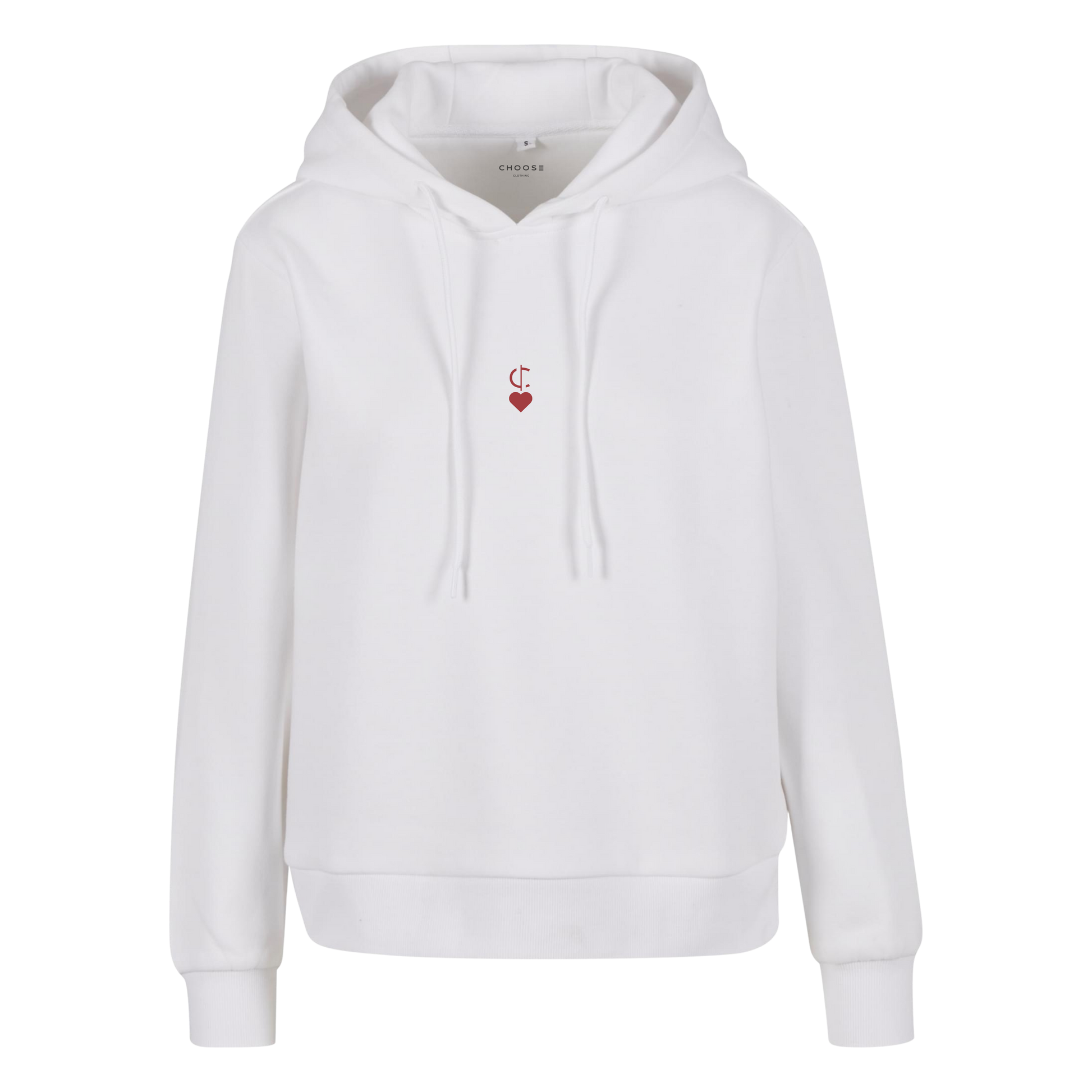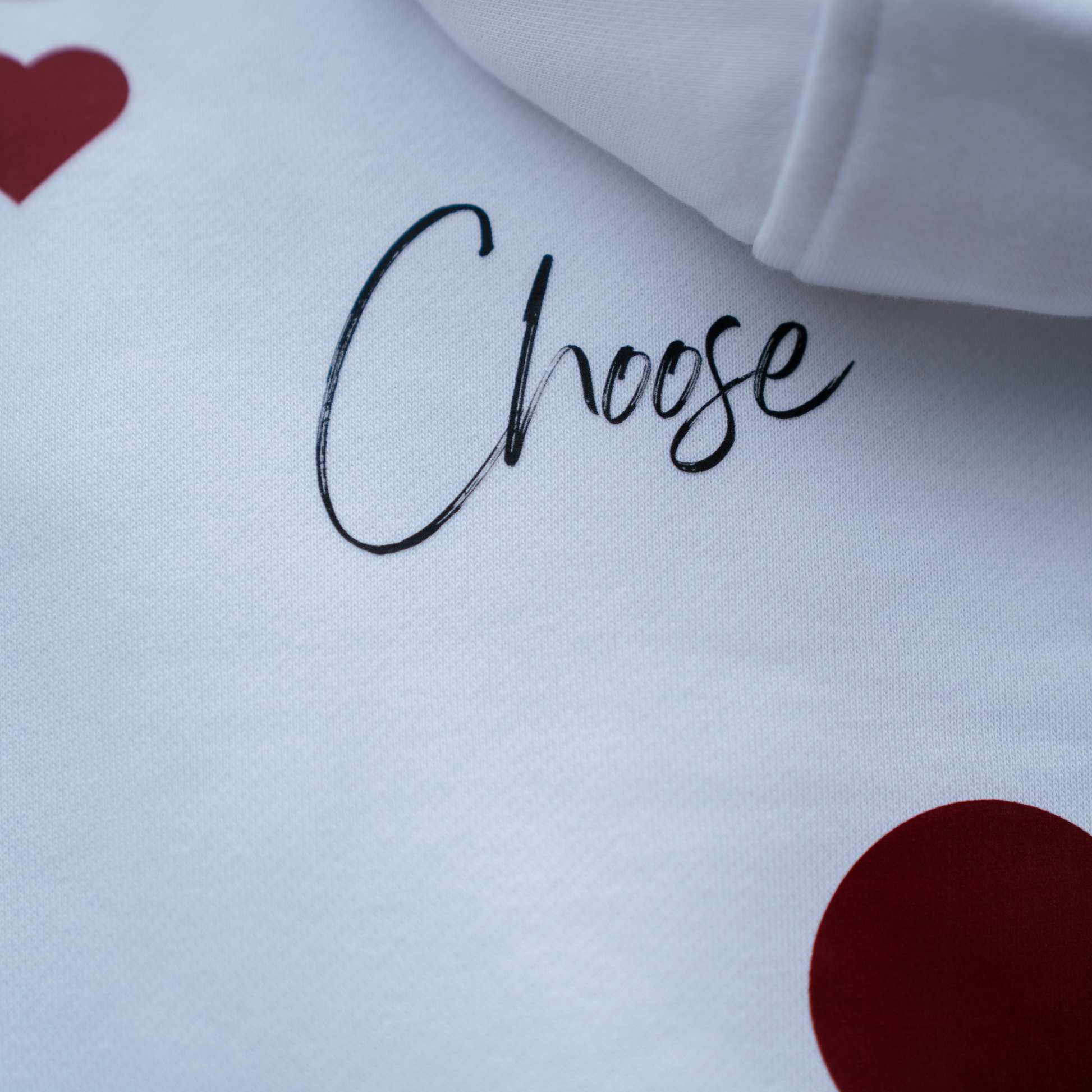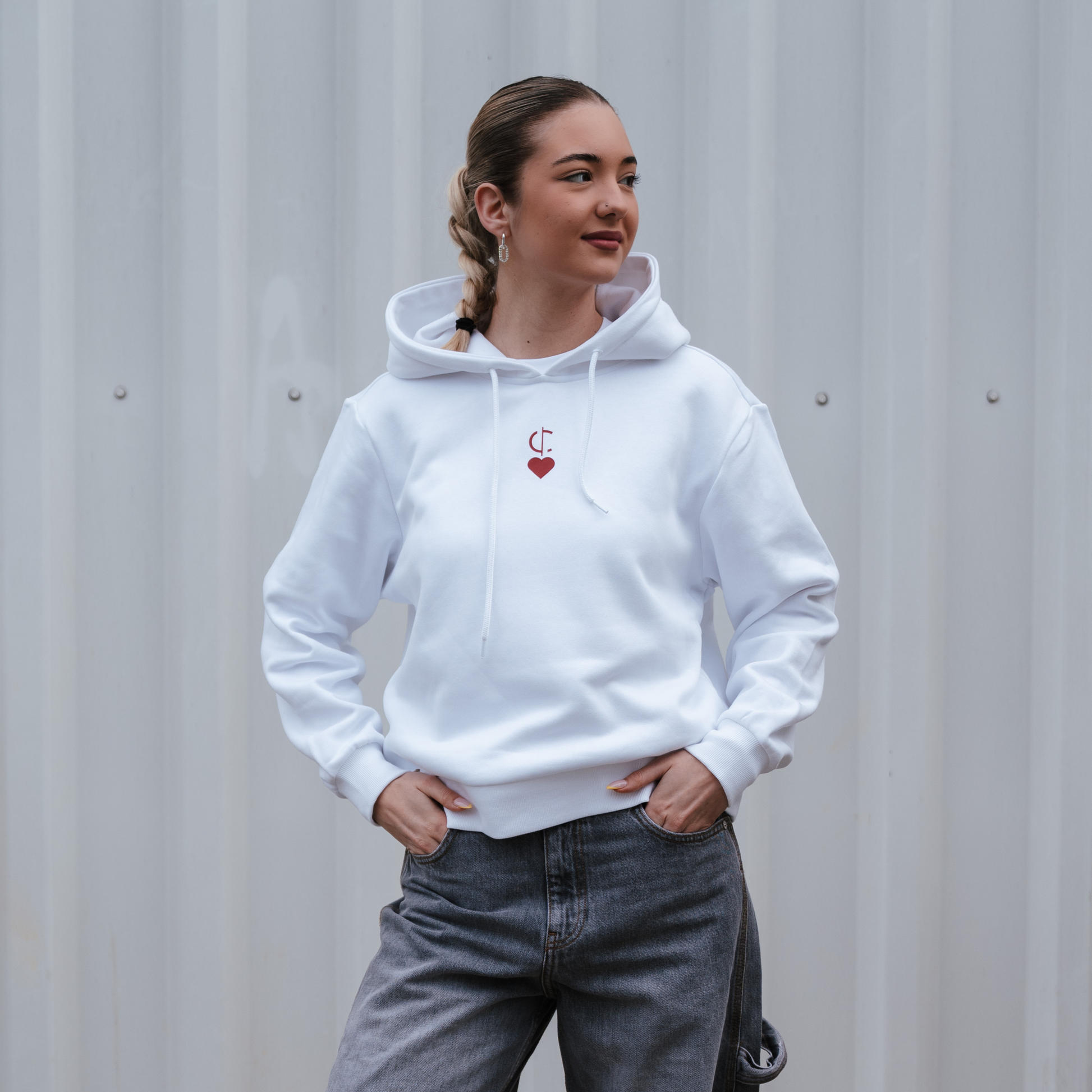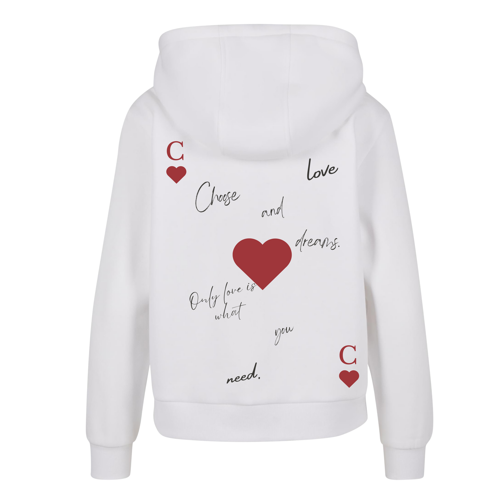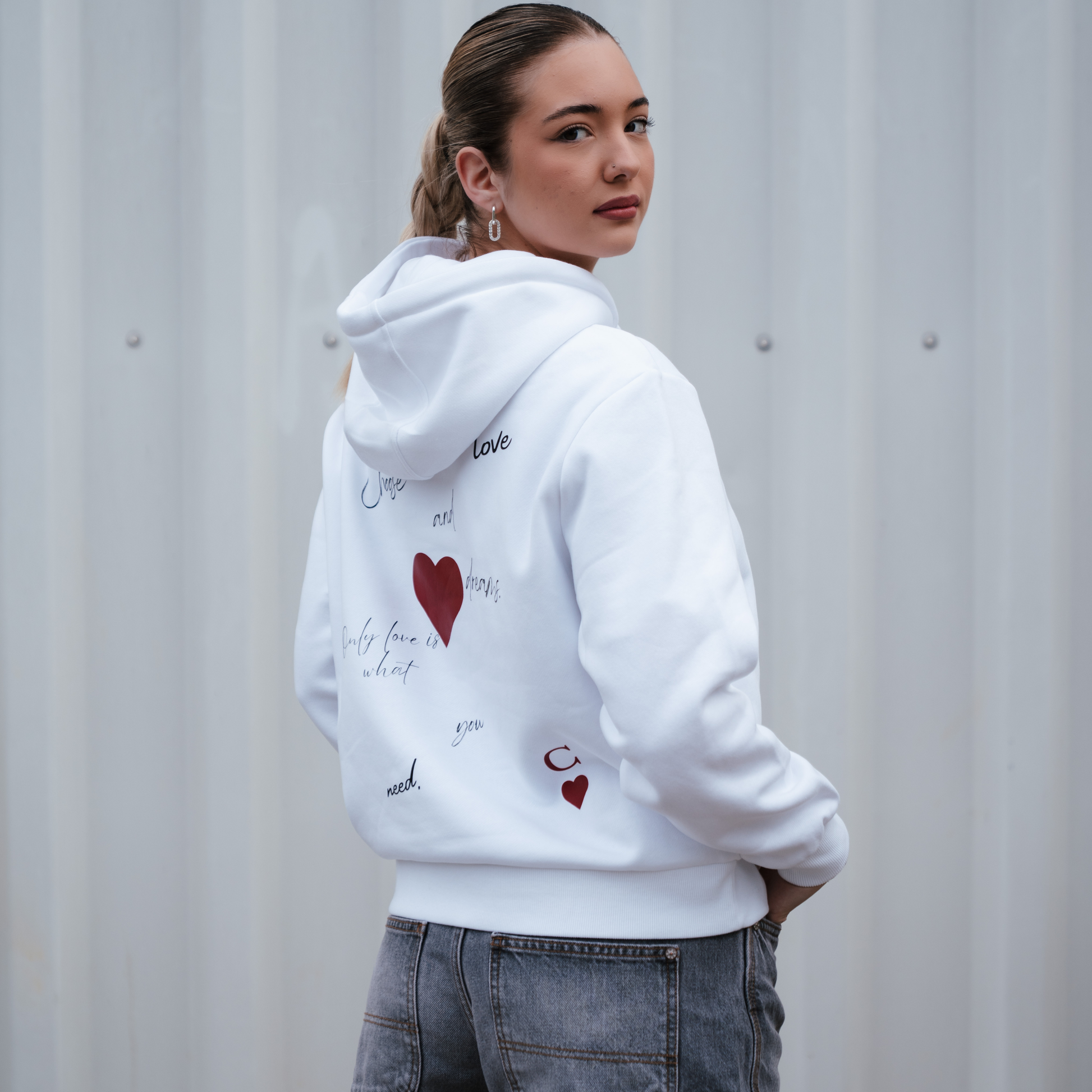 This white hoodie features a soft, expressive back print combining handwritten typography and subtle graphic details — centered around love, dreams, and intention.